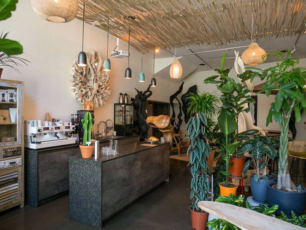 At this cafe I have picked and arranged posters for a cozier look. Hanged the ropes for plants in the greenhouse area. Put up the vinyl gallery.